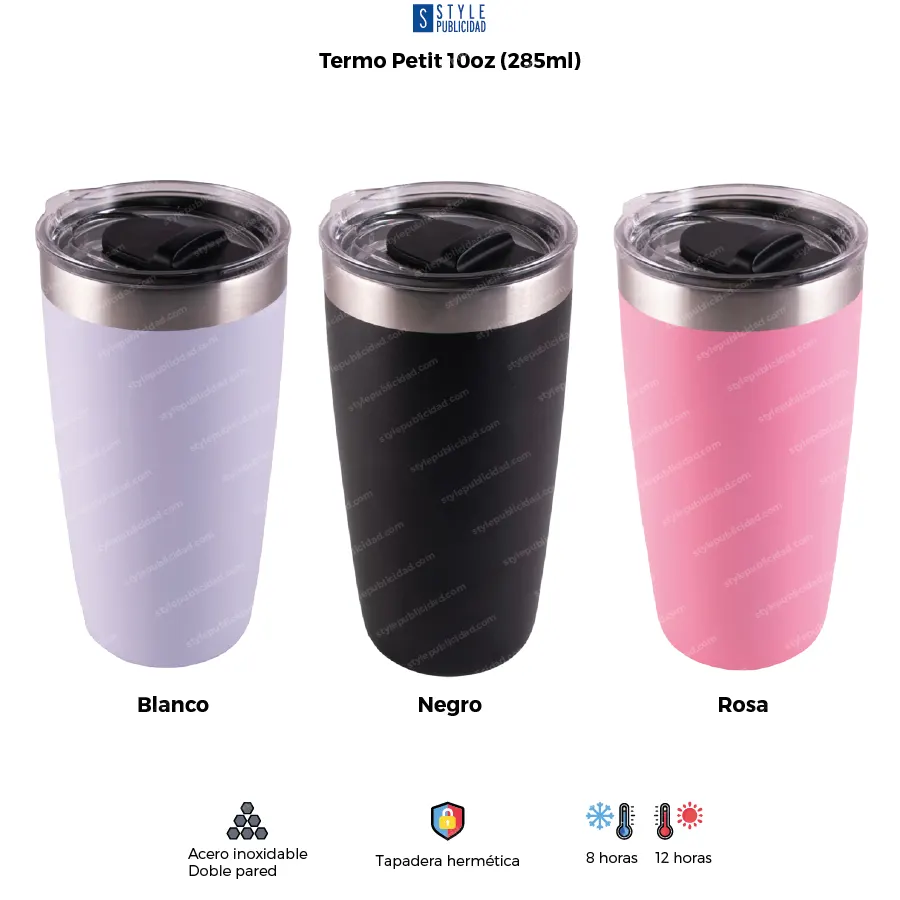 Pequeño en tamaño, grande en impacto. El Termo Petit de 10oz es la solución perfecta para quienes buscan portabilidad sin sacrificar estilo ni funcionalidad. Su diseño moderno y compacto lo hace ideal para café, té o bebidas frías en la oficina, eventos o en movimiento.